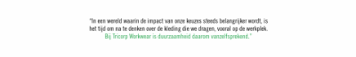 Klimaatproblematiek lossen we niet van de ene op de andere dag op. Dat weten we allemaal. Bij Tricorp doen we in elk geval wat we kunnen om te verduurzamen. Dat is voor ons vanzelfsprekend. En dat zou het in onze beleving voor iedereen moeten zijn.